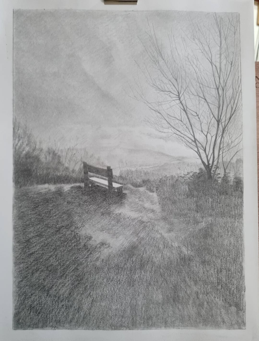 Trying to capture in graphite on Fabriano paper a scene I captured a few days ago... a very early, dark and wet wintry morning in January.
