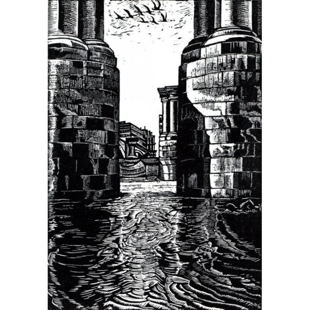 Is a small wood engraving of the old disused piers from the former Blackfriars railway Bridge which ran over the Thames. This is always such a magical view... A little snapshot of London architectural past.