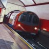 In this piece, a northbound Edgware train is arriving at Hampstead station. The tilted angle of the view - so often used by Rebecca to highlight the lines and symmetry of Underground tunnels - here also reflects the noise and turbulence of the train bursting through the tunnel portal at speed.